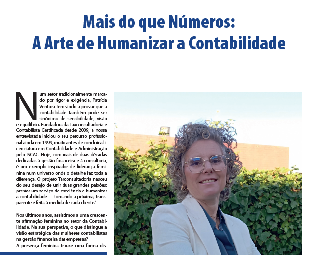 Na entrevista «Business Voice – "Mais do que Números: A Arte de Humanizar a Contabilidade"», partilho a visão de uma prática contabilística que combina rigor técnico com empatia, clareza e estratégia. A contabilidade deixa de ser apenas um registo para se tornar uma ferramenta de ...