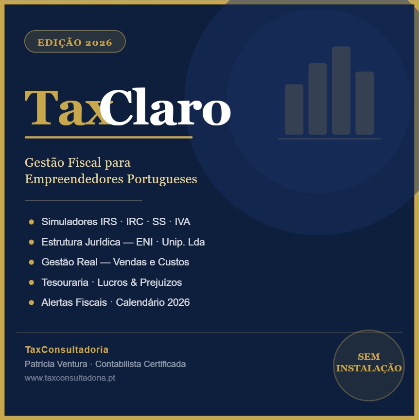 App interativa completa para empreendedores e freelancers portugueses. Simuladores IRS, IRC, IVA e Segurança Social 2026, comparação de estruturas jurídicas, gestão de vendas, tesouraria e calendário fiscal — tudo num só lugar, sem instalação.
